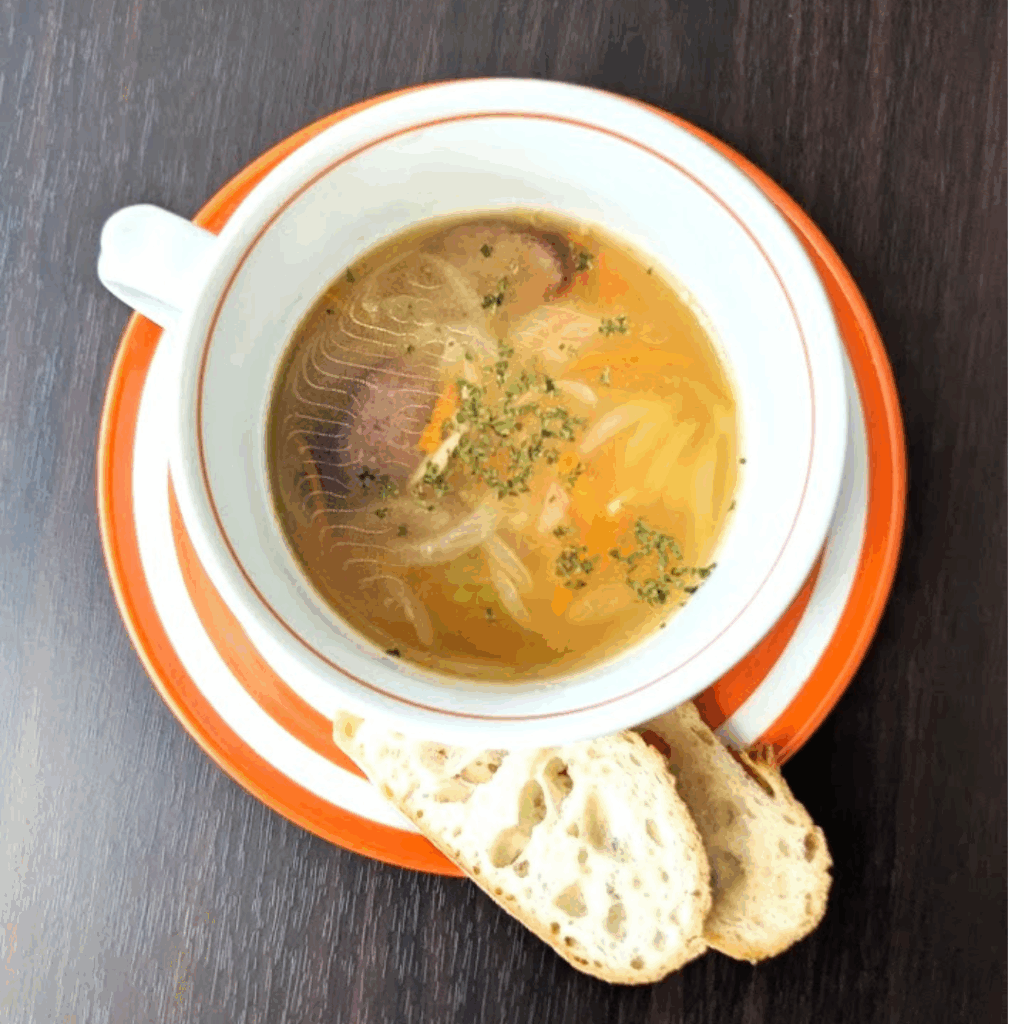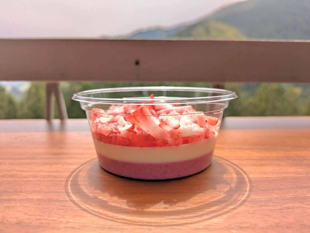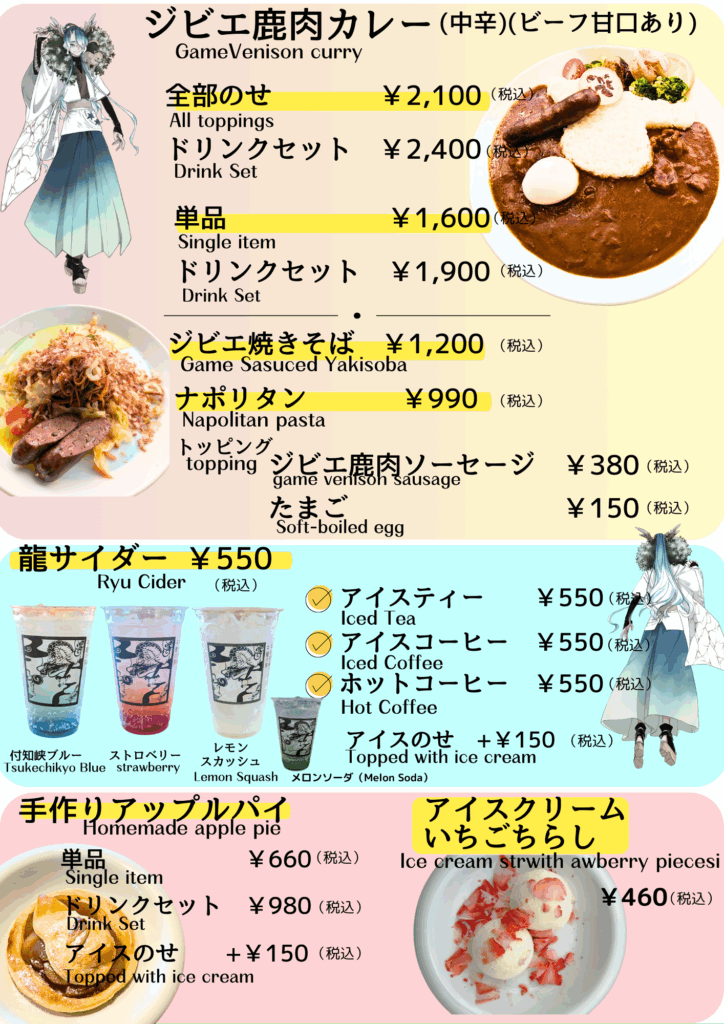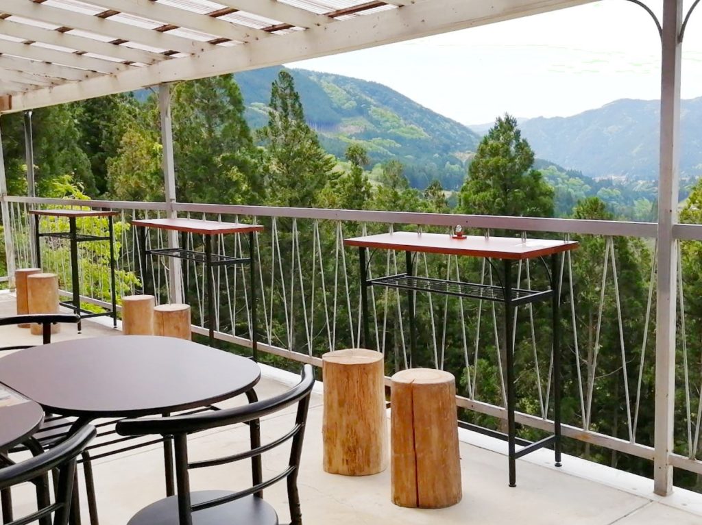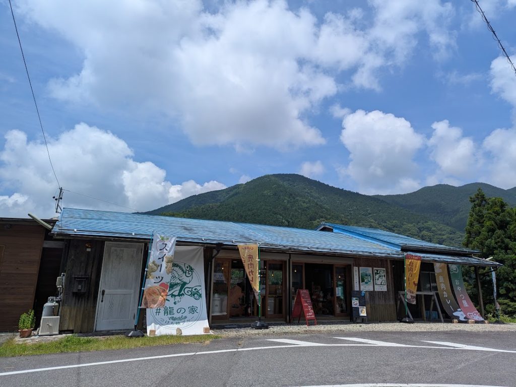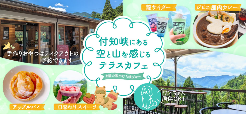 空と山の広大な景色が見えるテラスで、ジビエ鹿肉カレーと龍サイダー、手づくりアップルパイのお店です。