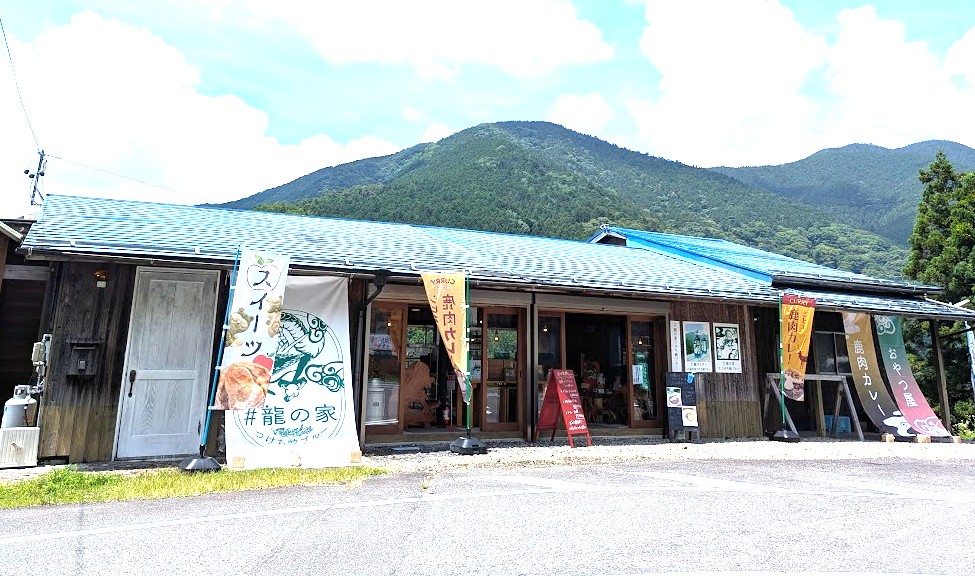 ⑤ 広い三叉路の左側に「#龍の家つけち峡ブルー」があります。